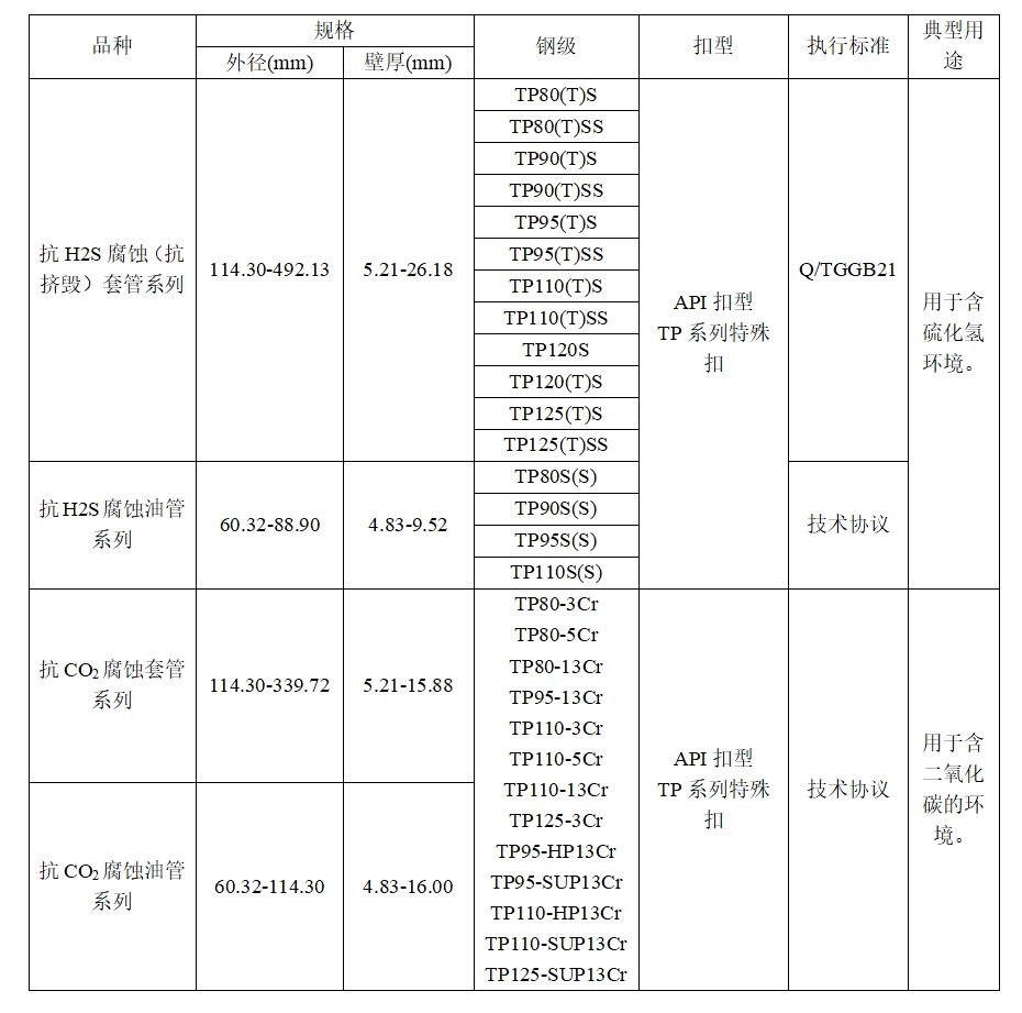 针对含酸性气体二氧化碳油气井开发的需要,我公司研制了13Cr系列马氏体不锈钢,该系列产品具有优异的抗二氧化碳腐蚀性能。通过合金元素的调整,又相继开发出可应用于更高温度并具有良好韧性的HP13Cr系列和可应用于微量硫化氢环境的SUP13Cr系列。目前,该系列产品已经广泛应用于东北和西北地区,并大量出口到非洲和东南亚等地区。